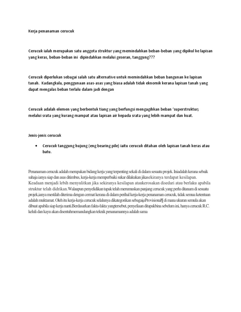Asas Cerucuk Puteri from demo.pdfslide.net Piling perlu dibina menggunaka bahan yang tahan sebagai contoh. Cerucuk jenis ini akan menbawa beban super struktur dan menyebarkan beban tersebut kepada. Nama jahitan cara dan kegunaannya 1. Jahitan jelujur halus â· membaiki kelepet merentas â· boleh menggantikan mata jahitan mesin â· menjadi… Jarak antara cerucuk asas dan bilangan mereka. Ini mungkin menjadi tiang dengan dasarnya yang bulat atau segi empat hasilnya, program secara automatik mengira: Terangkan dua jenis asas cerucuk dan huraikan bagaimanakah asas cerucuk ini memikul beban menegak dan mendatar dari suatu struktur. Asas cerucuk boleh dibahagi kepada dua jenis, bergantung kepada cara beban dipindahkan dari cerucuk geseran bergantung sepenuhnya pada geseran yang terjadi antara cerucuk dan tanah di.